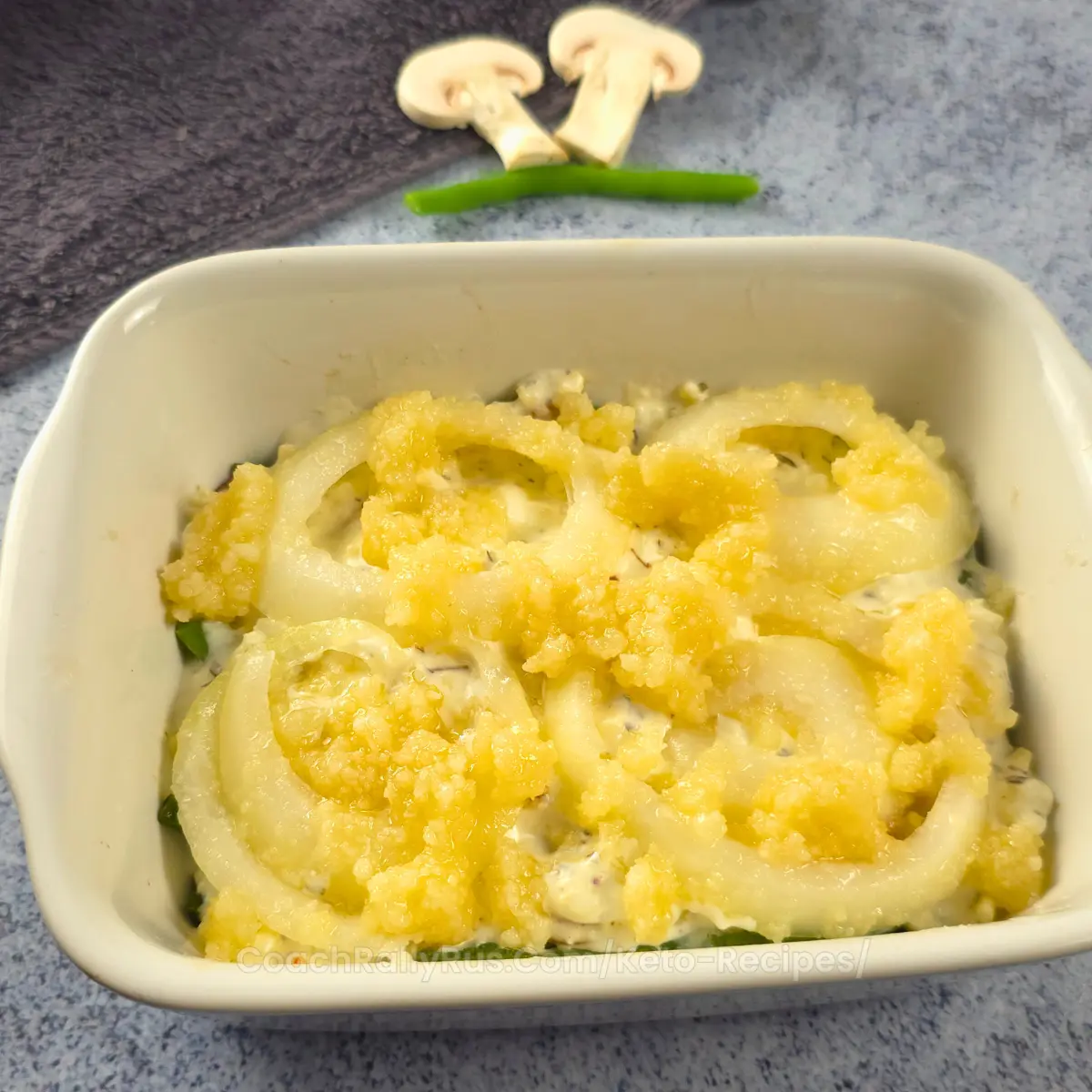 - Make the Crispy Onion Topping: In a separate bowl, toss the thinly sliced onions with almond flour, grated Parmesan, and olive oil until well coated. Spread the onion mixture evenly over the top of the casserole.