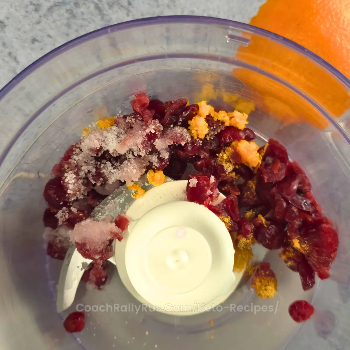 - Add the fresh cranberries, keto sweetener, orange zest, and ground ginger to a food processor or blender. Pulse until the mixture forms a chunky, relish-like texture. If you prefer a smoother consistency, blend a little longer.